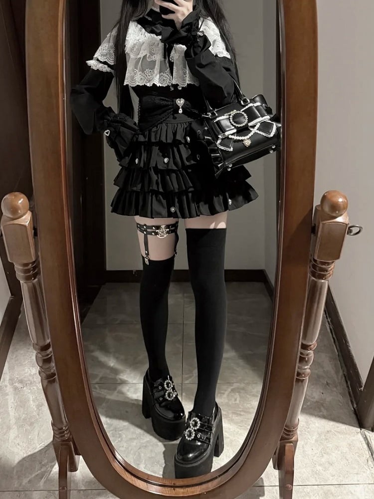 Decorated Lolita Multi-Layer Calf White/Black Bow Trim Lace Socks