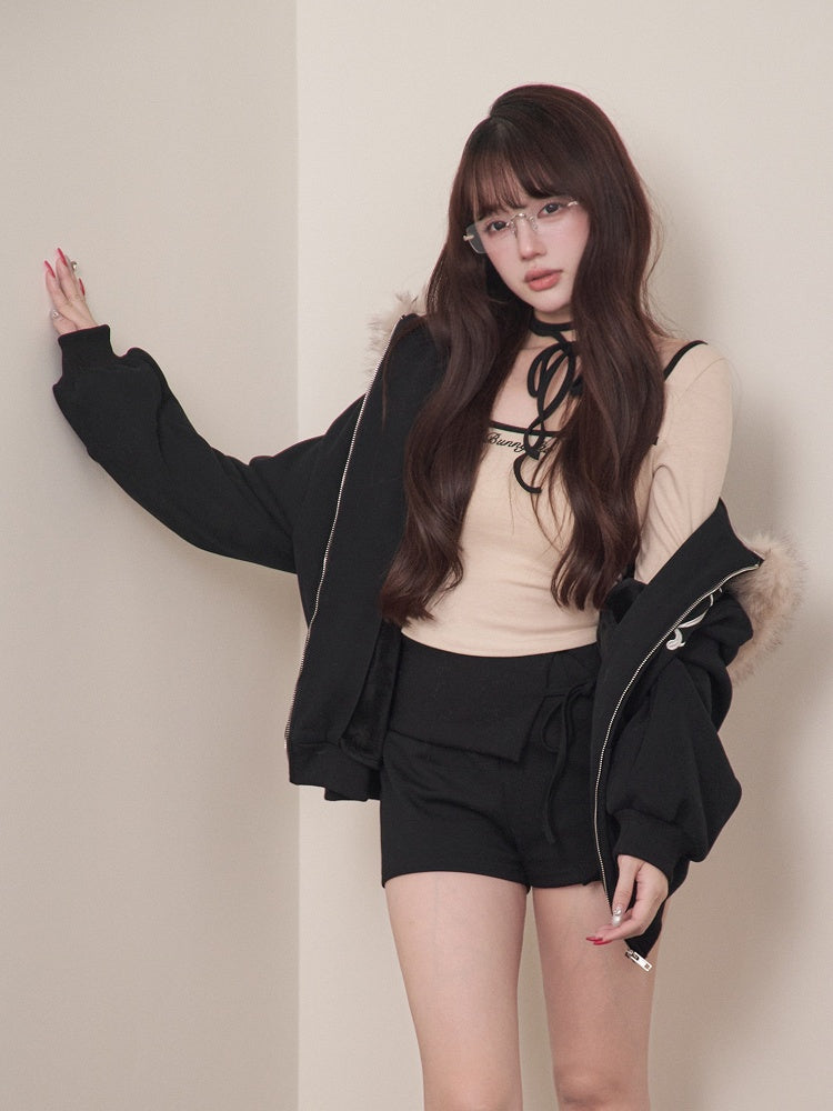 Black Letter Embroidery Knit Jirai Kei Hooded Jacket with Faux Fur Collar