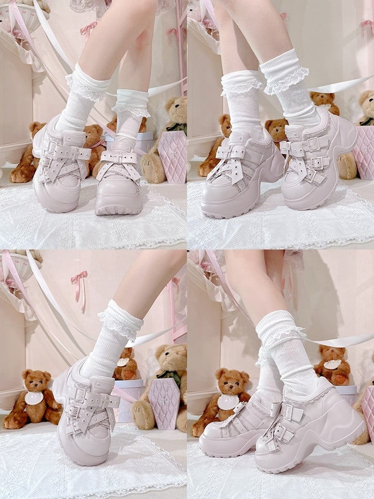 Pink Jirai Kei Platforms in PU with Delicate Lace Edging, Cross Decor Bow & Buckle Fastening