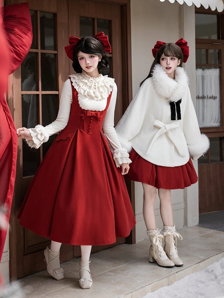 New Year Red Under Bust Lolita Long Version JSK + Beige Knit Top + Bow Hairclip