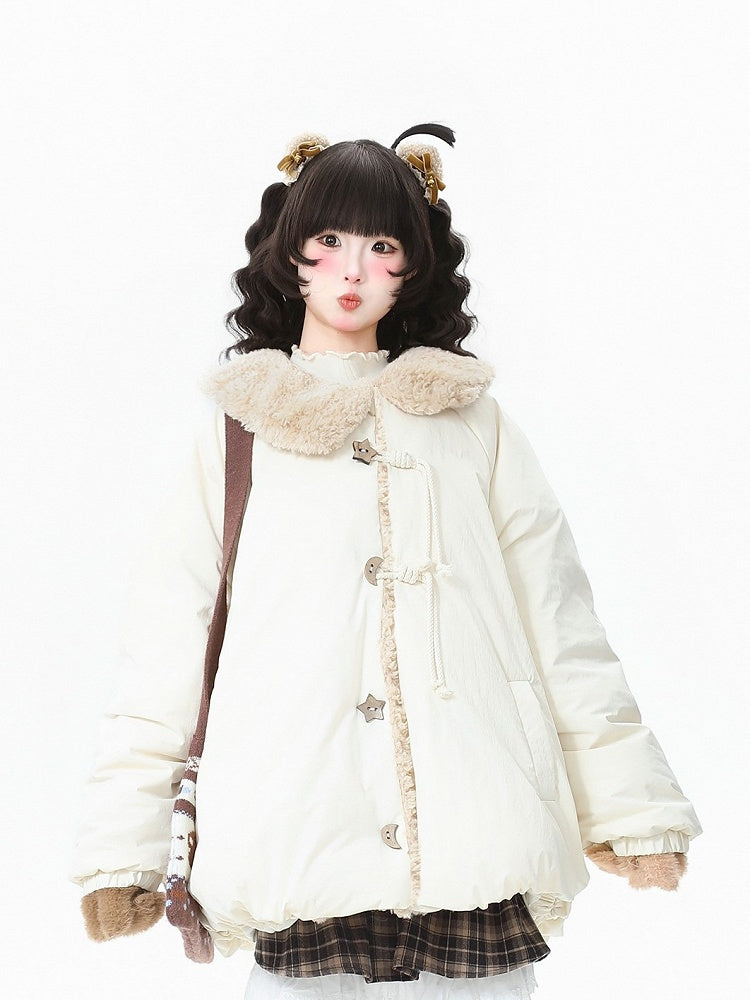 Kawaii Coat Plush and Beige Collar - Buttons Down Star Decorative Moon