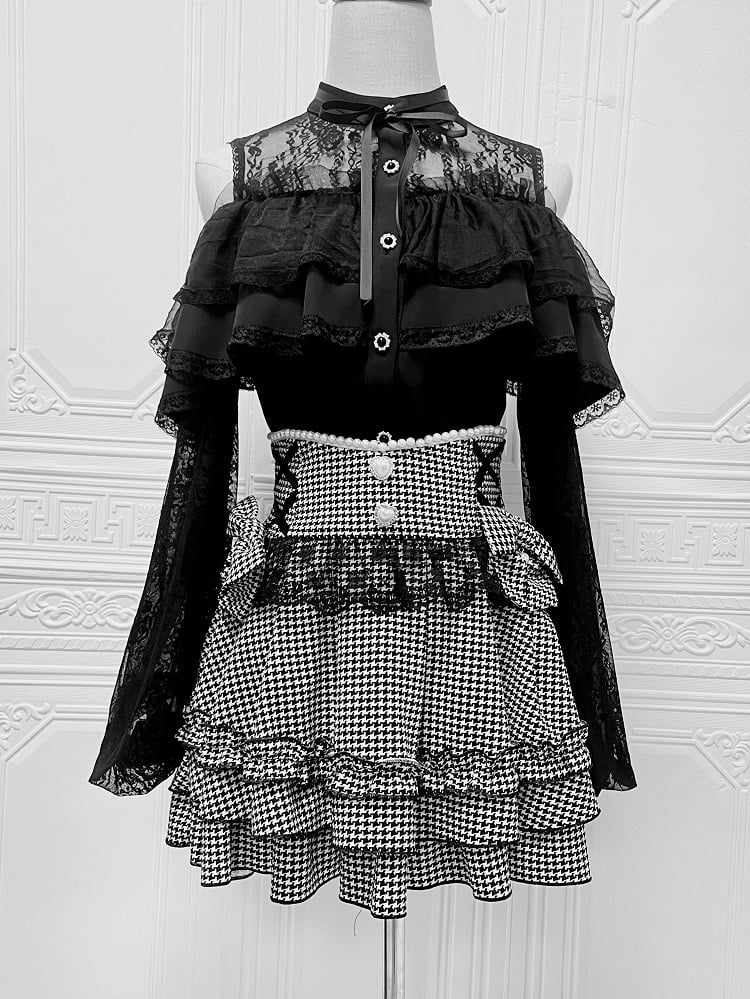 Black Houndstooth Jirai Kei Skirt:Elegant High-Waist Designwith Laceand Beading