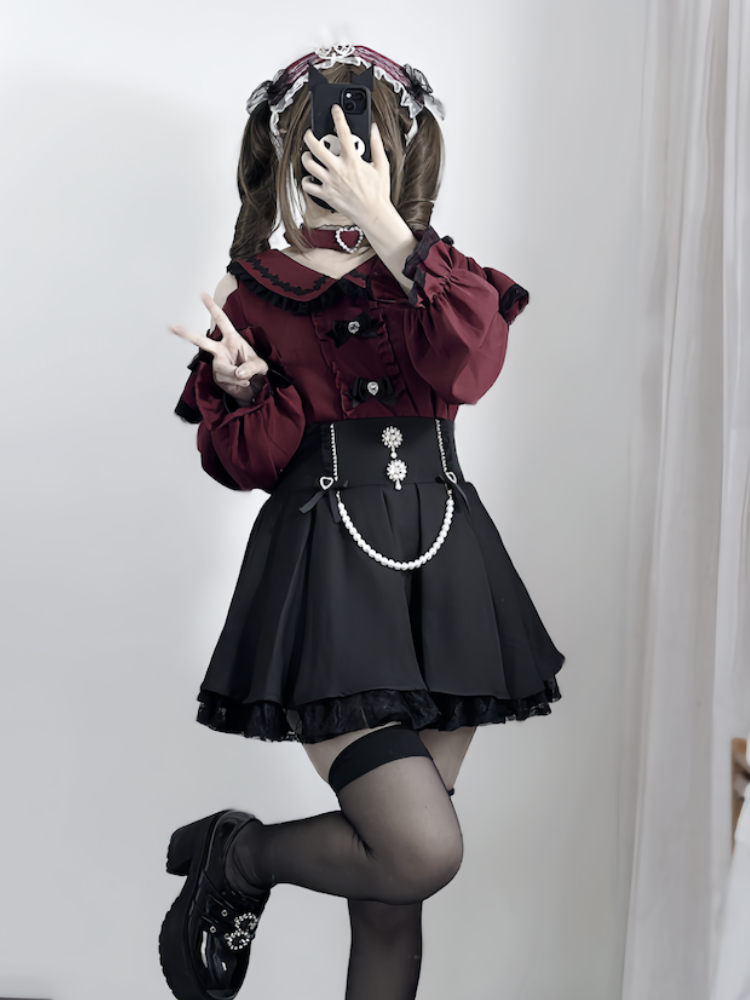 Black High Waist Lace Trim Round Rhinestone Jirai Kei Skirt with Beaded Chain
