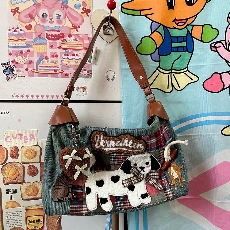 Kitten Puppy Bag and Pink Washed with Vintage Patches Artisanal Blue Plaid Shoulder Denim