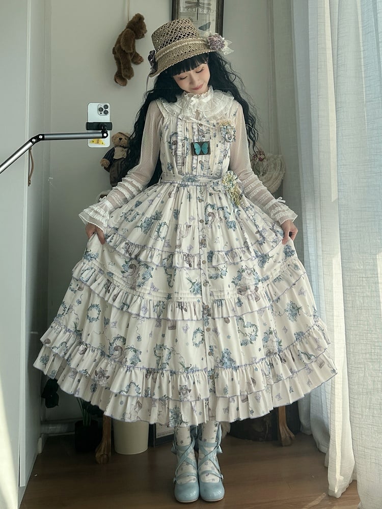 This adorable Lolita jumper skirt features a charming kitty and floral print, as well as a front button placket for a natural and effortless style. Perfect for adding a touch of cuteness to any outfit, this skirt is a must-have for any lover of all things kawaii.