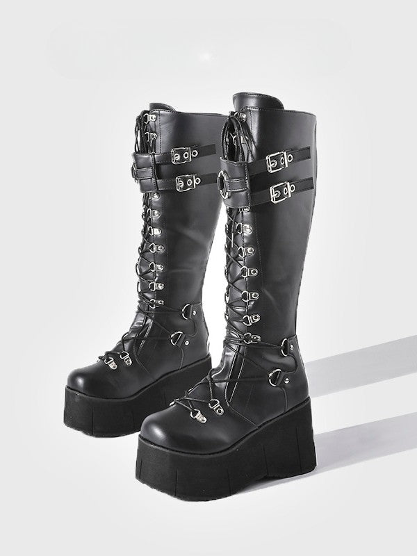 Black Platform Knee-High Boots in Punk Style - Triple Fastening System with Buckle, Back Zip & Lace-Up Design