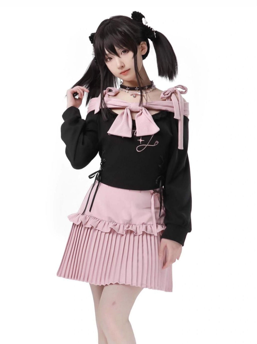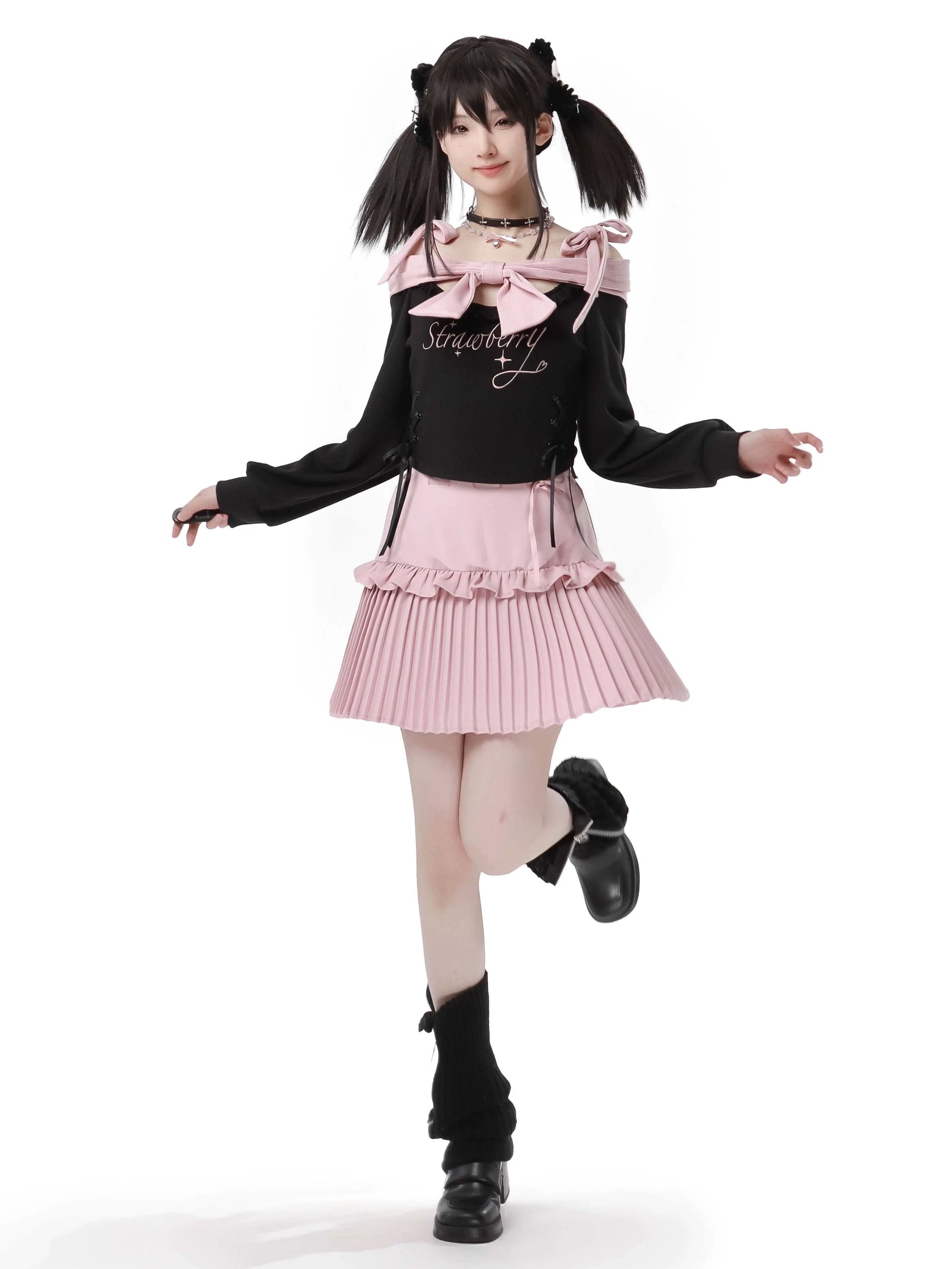 Knit Pink Ribbon + Straps Black Off-Shoulder Top