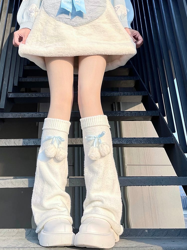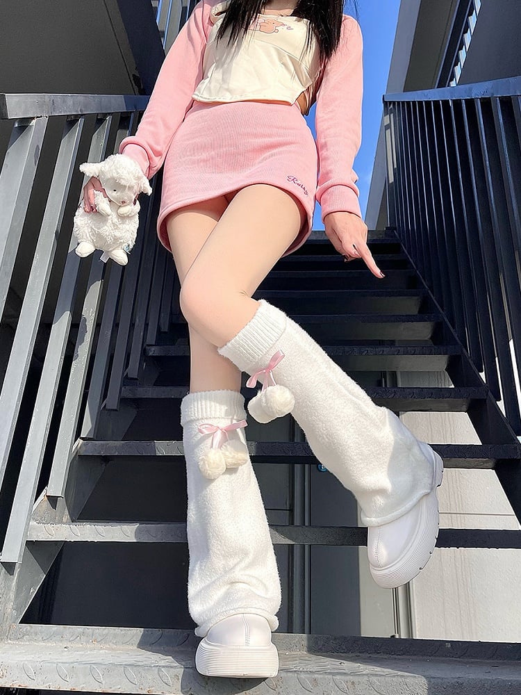 White Knitted Flared Leg Warmers with Red/Pink/Blue Ribbon Pom-Pom Decorations