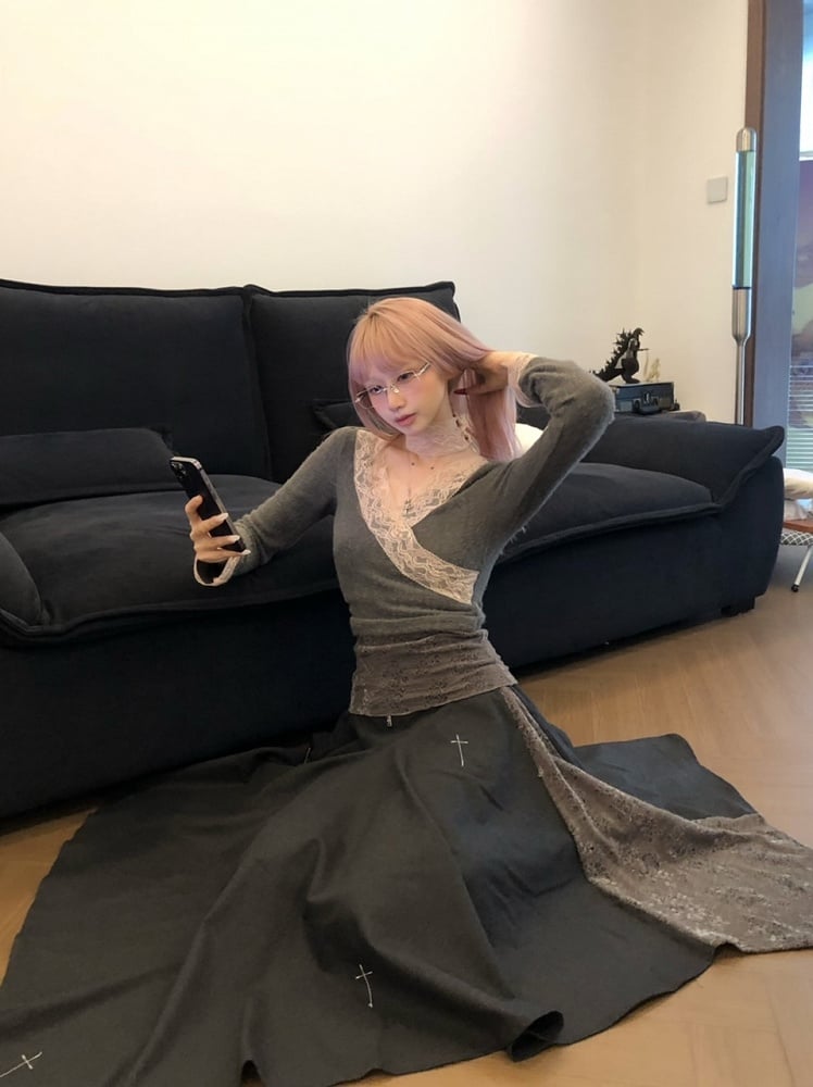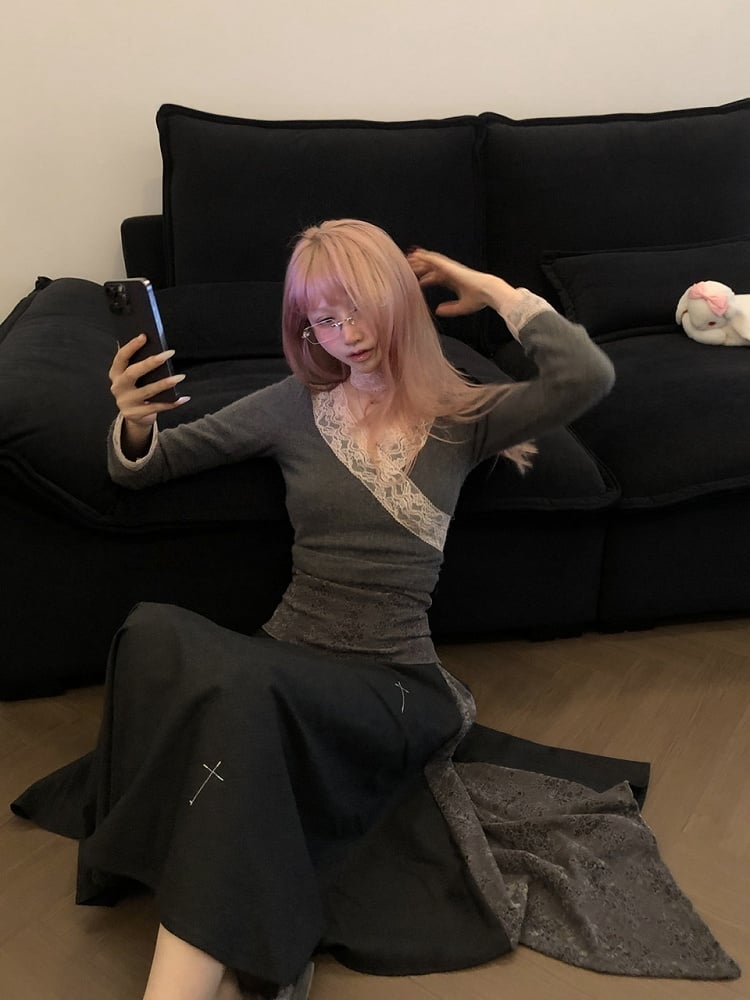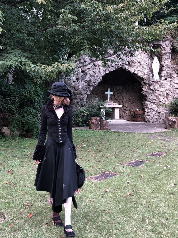 Black/Dark Gray Gothic Lace Embroidered Ankle-Length Skirt with Cross Stitch Detailing