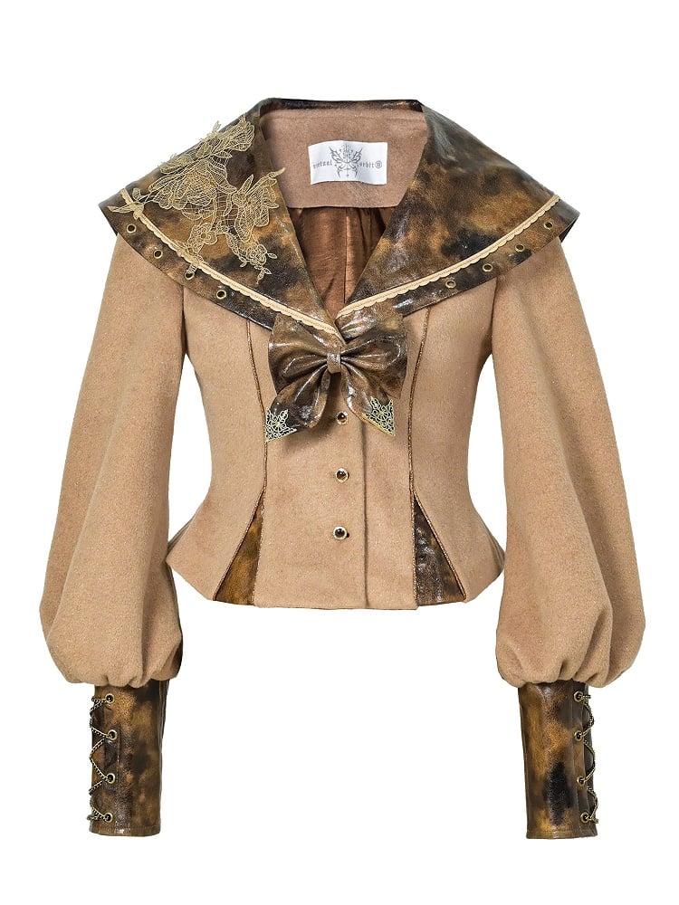 Lace Collar Applique Steampunk Embroidered Top PU with Khaki Sailor Brown
