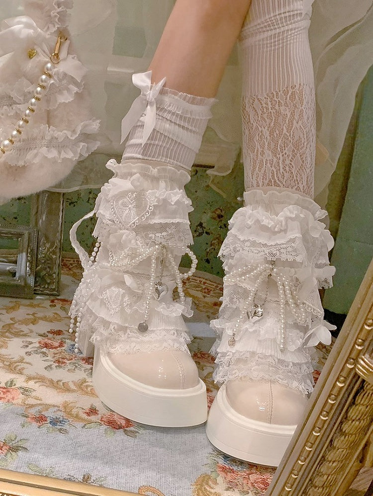Off-white Elegant Lolita Platform Boots with Lace Trim, Beaded Accents & Bow Details