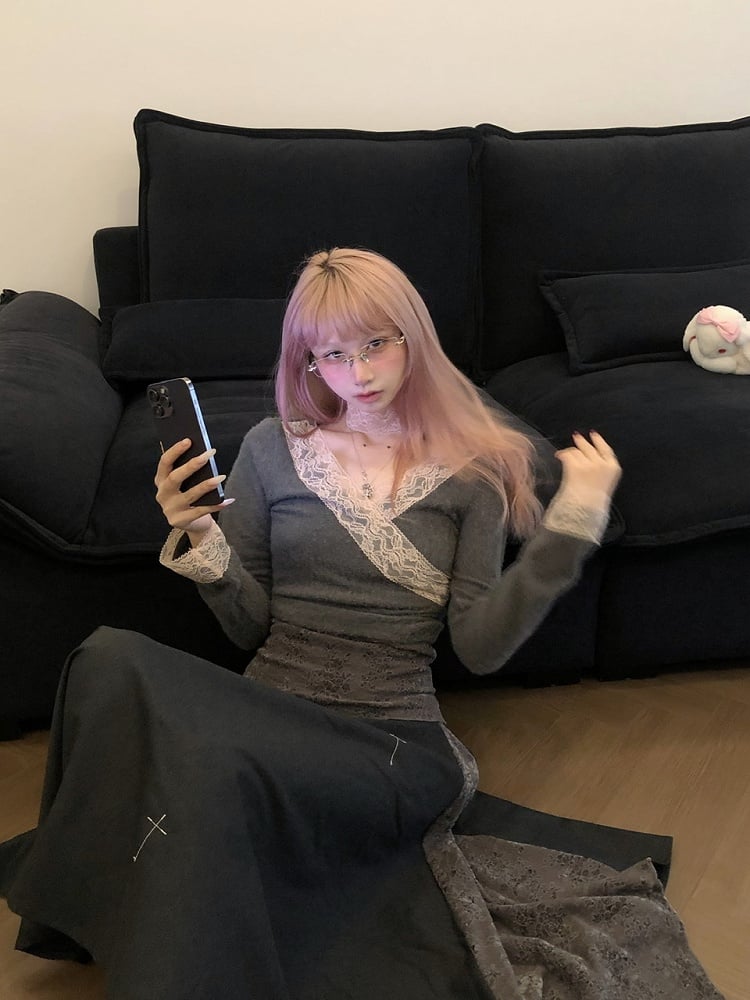 Lace Long Pink Trim Sleeve Top Gray Crossover