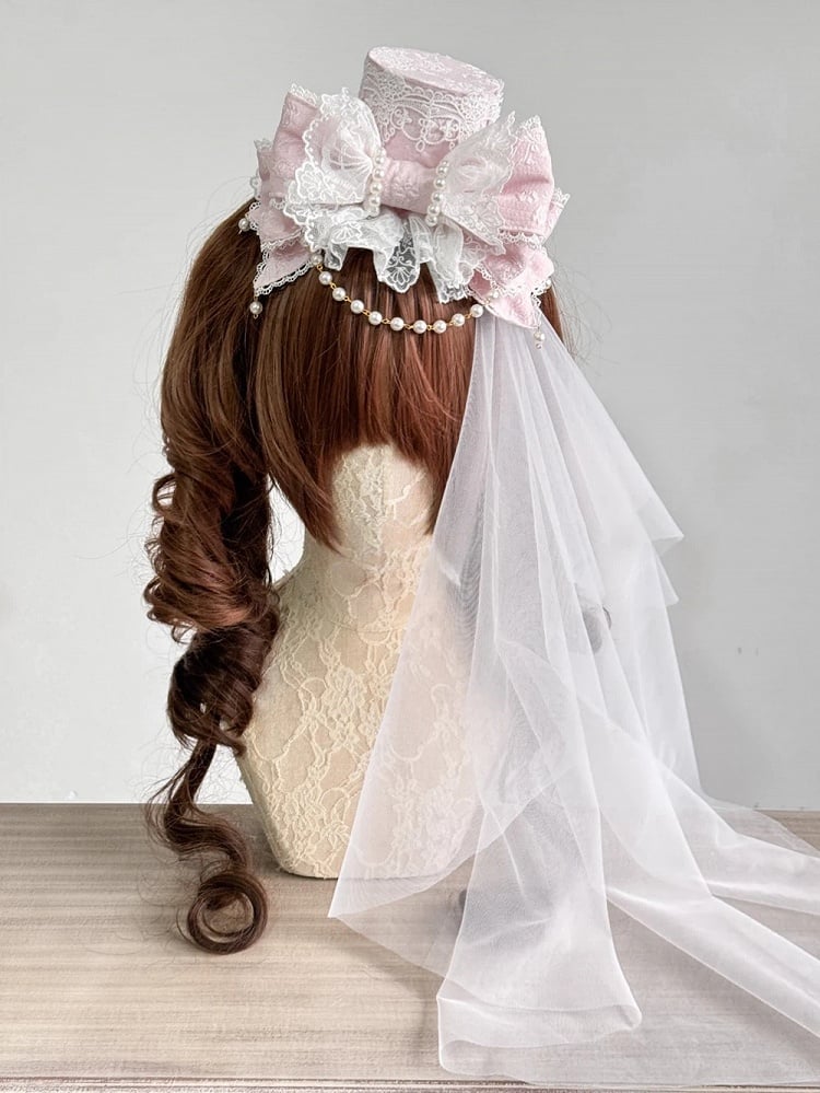 (Lace Pink Head Pastel Pearl Details) Lolita Hat with Veil Sweet Mini