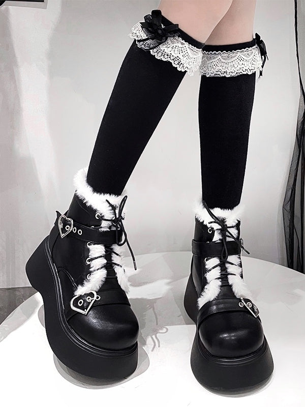 Lace-Up Platform Black Design Buckle Heart Lined PU Boots Plush with - Punk