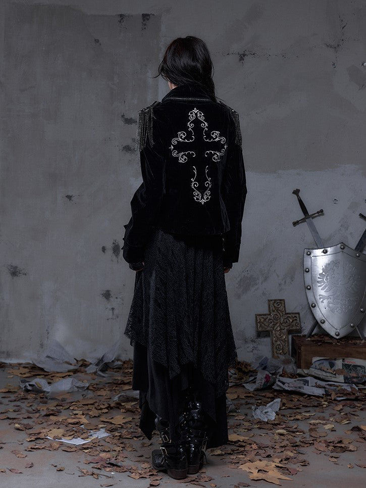 Black Punk Back Cross Embroidered Blazer with Detachable Fringe Shoulder Epaulettes & Multi-Row Lapel Buttons
