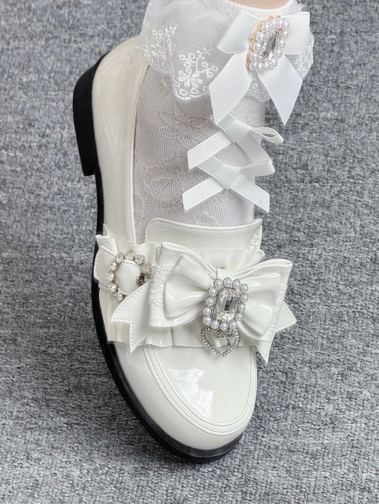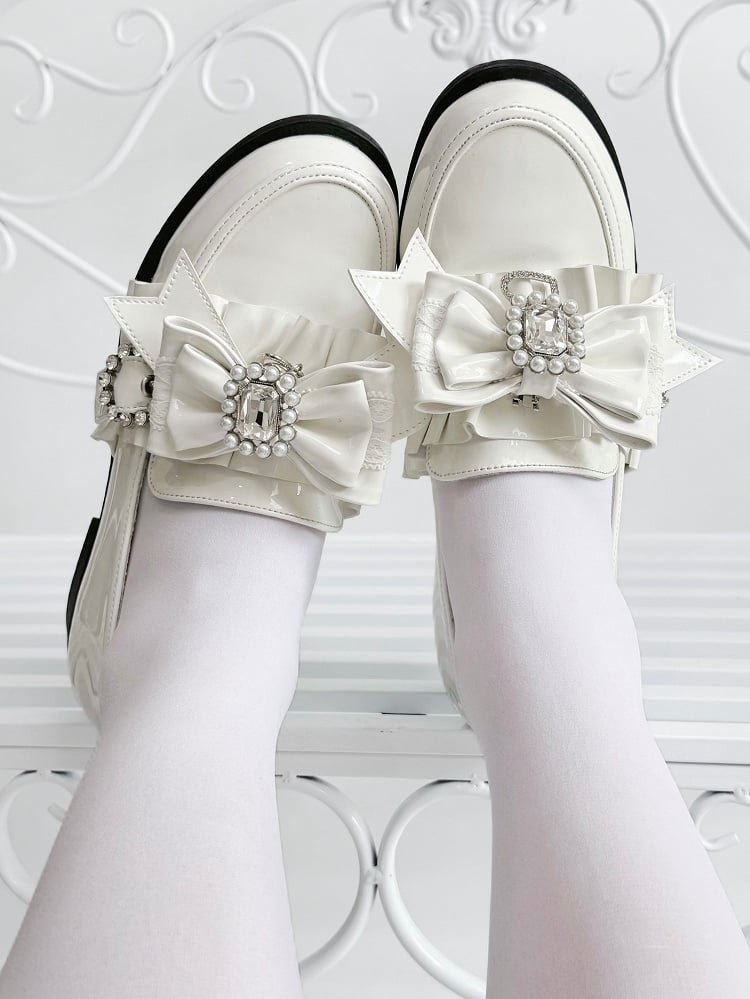 PU Leather Polished White Jirai Kei Low Heels with Rhinestone Bead Bow, Ruffles Edging & Slip-On Comfort