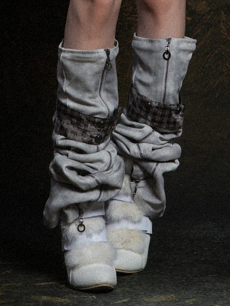 Gray Punk Leg Warmers with Black Plaid Button Strap & Vertical Zipper