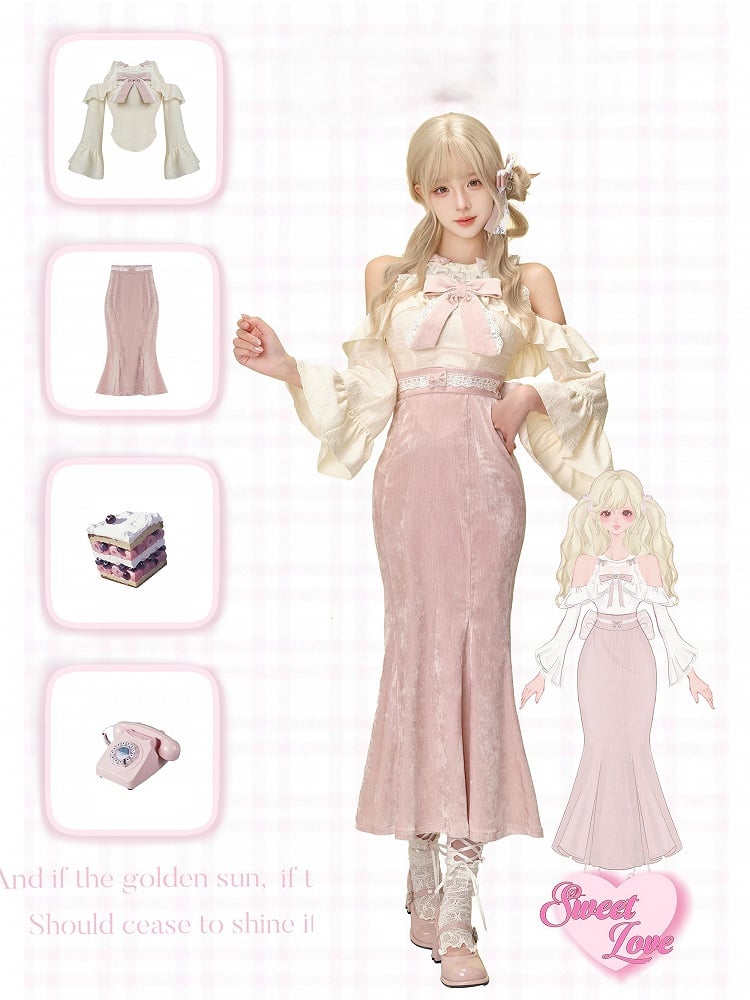 - Length Tea Skirt Pink Mermaid with Bow-Adorned Waistband
