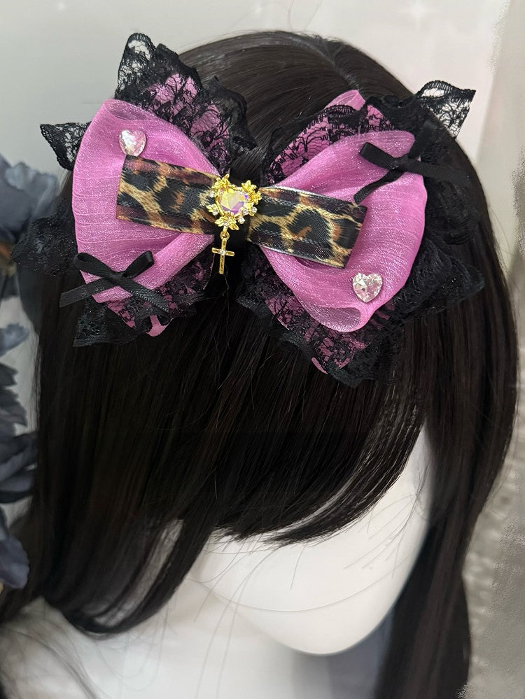 Rose Red Leopard Pattern Rhinestone Heart Decorated Lace Trim Bowknot Hairclip