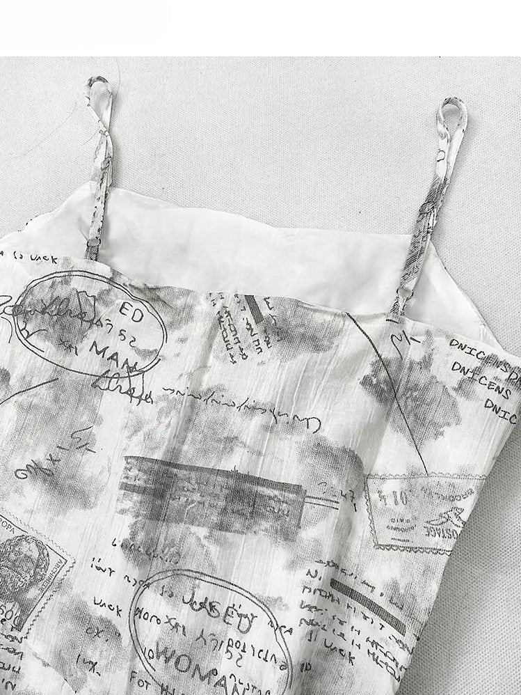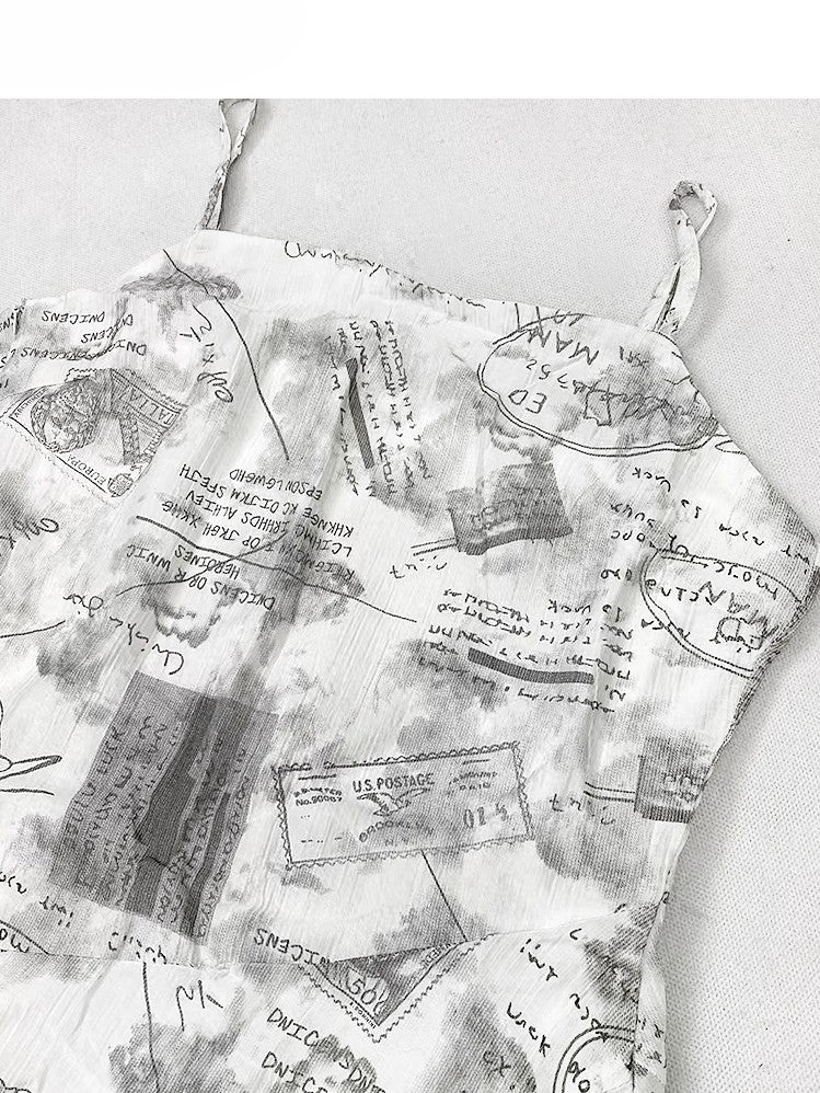 White Letter Print Asymmetrical Hem Cami Dress With White Cascading Ruffle Trim Underskirt