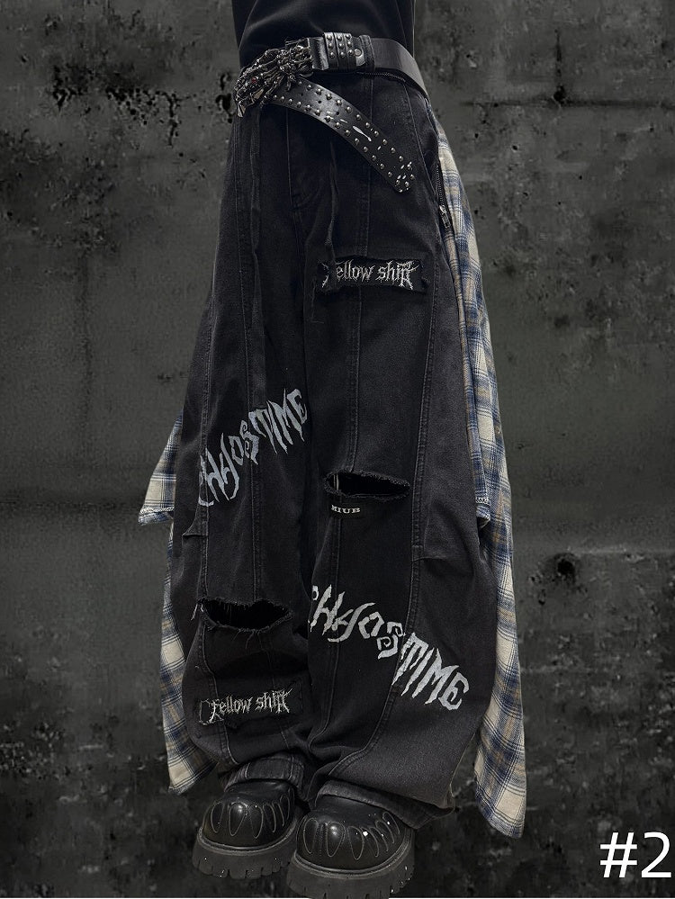 Letter Distressed Black Pattern Two-piece with Y2K Holes Jeans Wide-leg