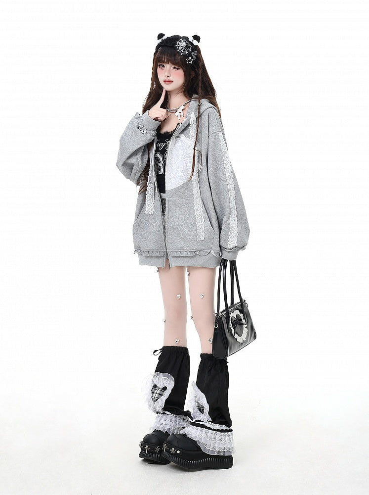 Light Gray Lace Applique Ruffled Trim Zip Closure Hoodie