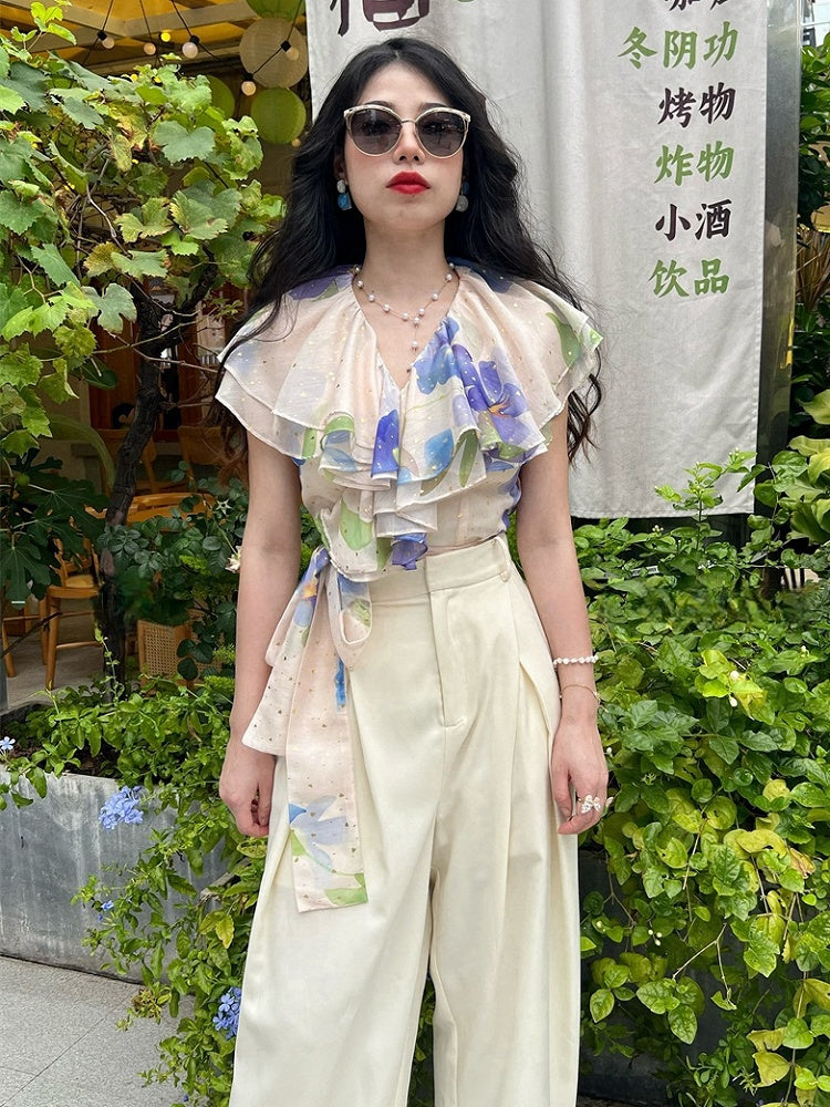 Light Pink Vintage Blue Floral Print Tiered Shawl Collar Chiffon Top