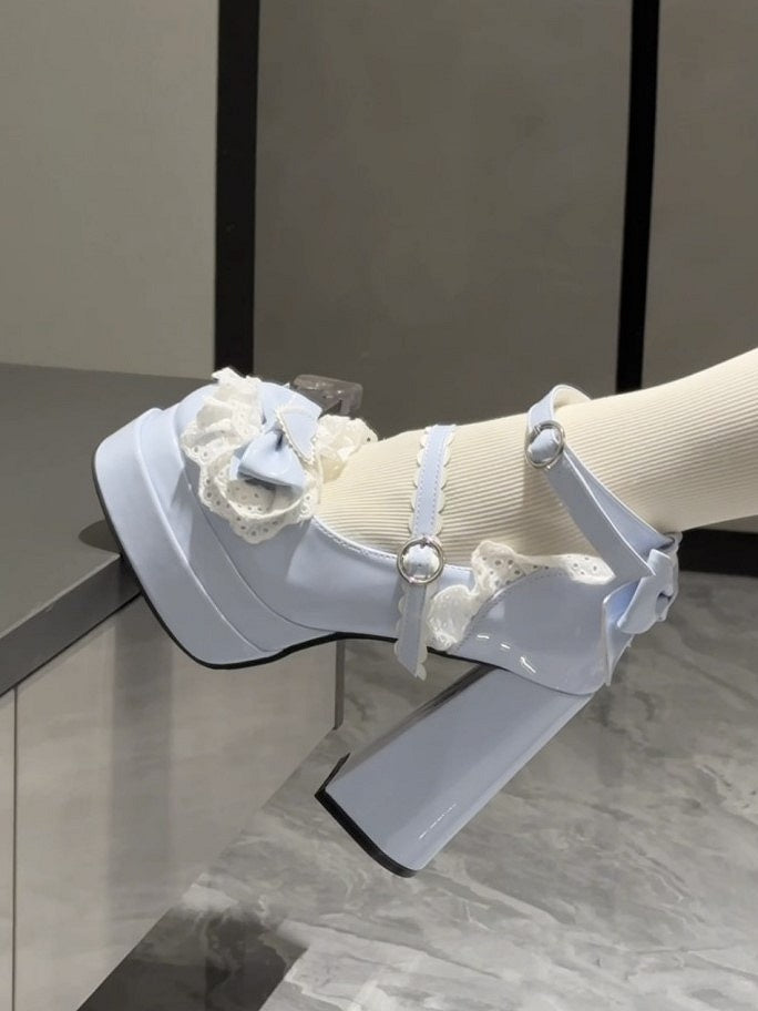 PU Light Blue Sweet Lolita High Heels with Circle Buckle, 12 cm Heel & Bow Accents