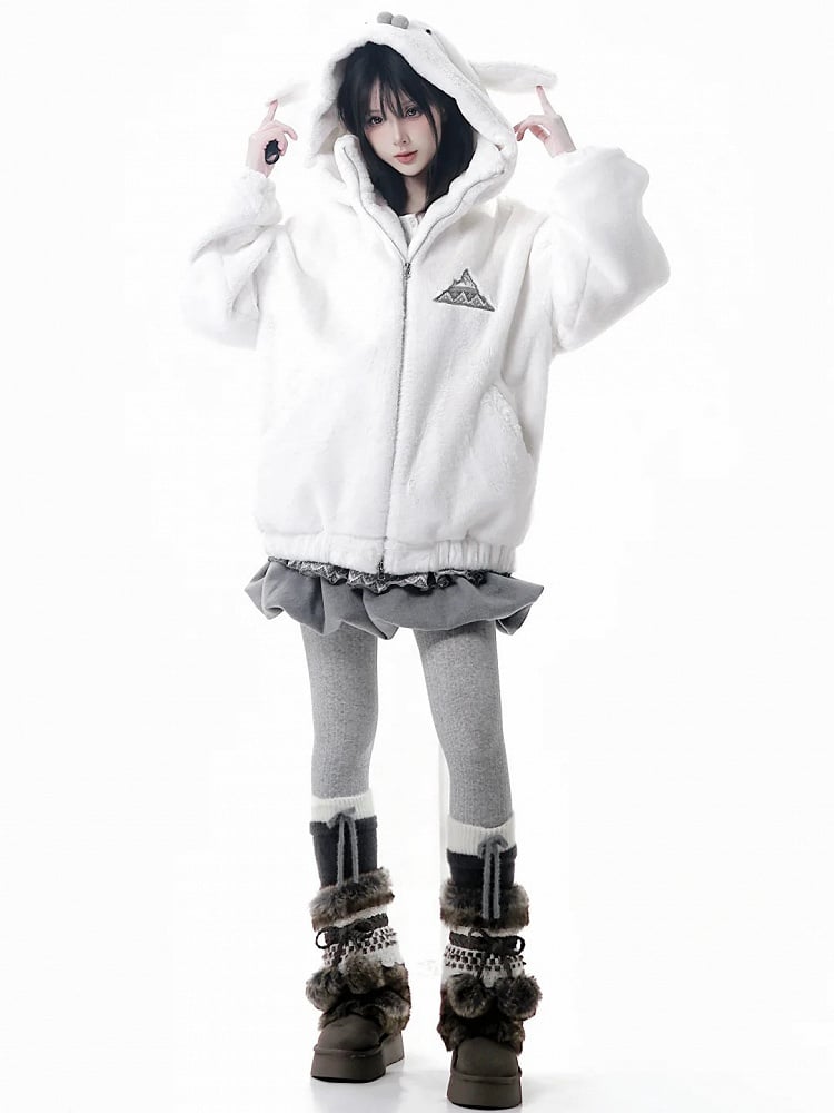 Lining Seal-inspired White Hooded Cozy Jacket with Fleece Plush