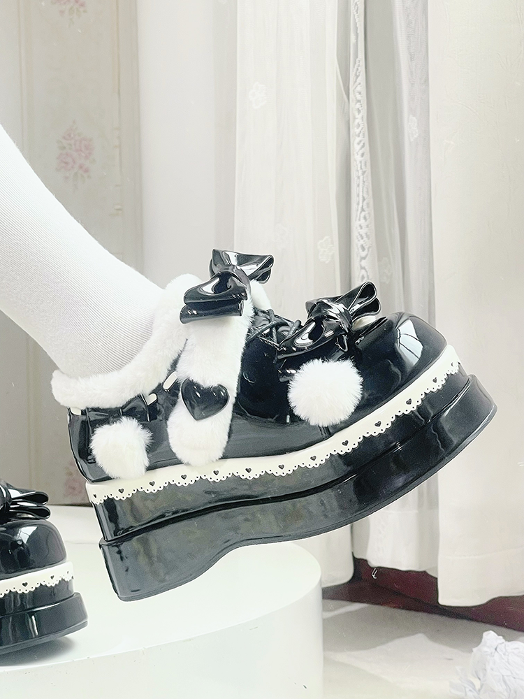 Elevate your style with these adorable Lolita Black Cute Heart Bowknot Platform Shoes. The charming pompons and elegant bowknot add a touch of cuteness to these shoes, while the platform design provides comfort and support. Perfect for a unique and playful look.