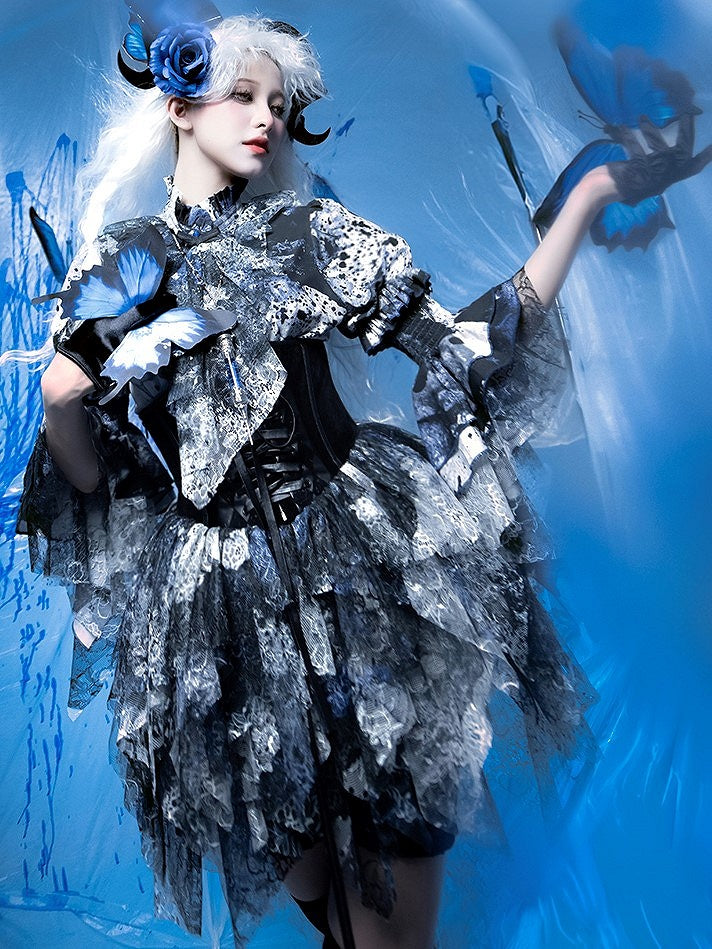Lolita Bloodstain with Print Train Blue Boned Corset Black Lace Gothic Belt