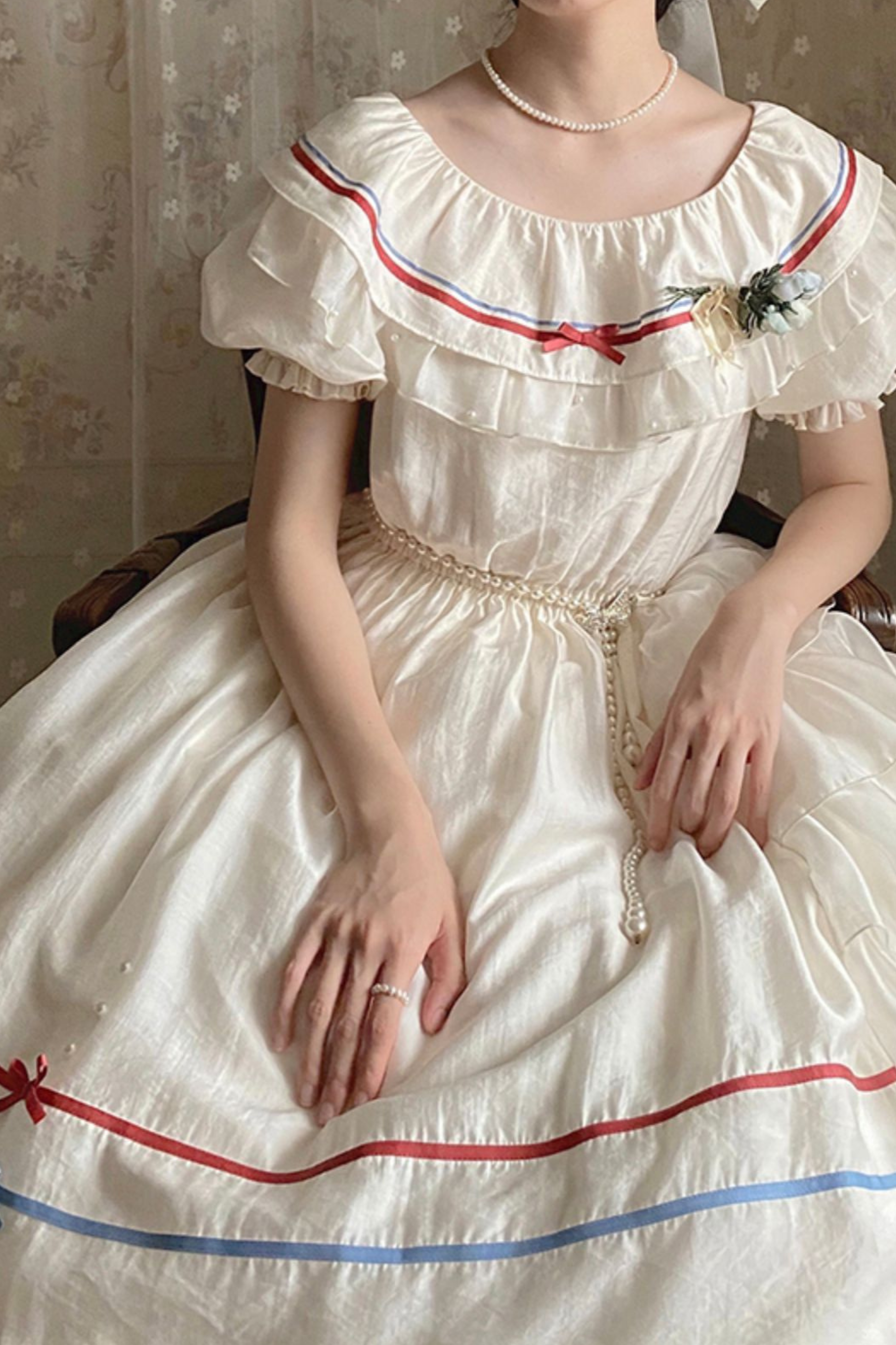 Blue and White Old School Lolita Fashion Dress Bowknot Detais JSK Set