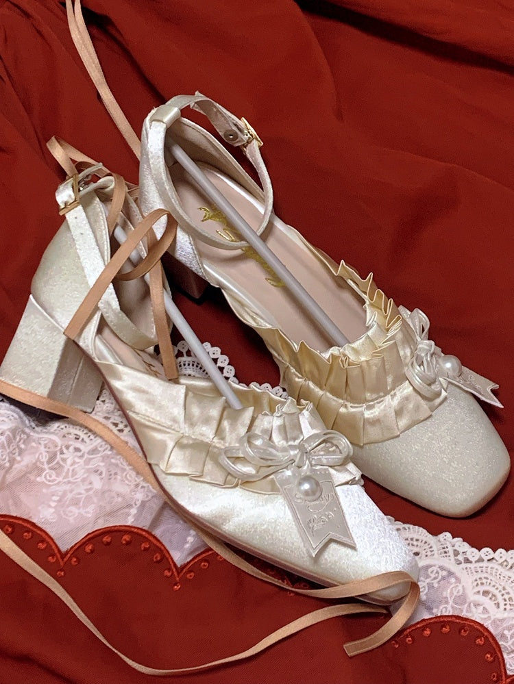 Off-white Elegant Lolita Square Toe Sandals - Tiered Ruffle Trim, Detachable Bead Cahrm Bow & Ankle Strap Closure