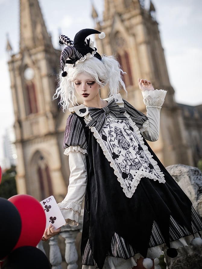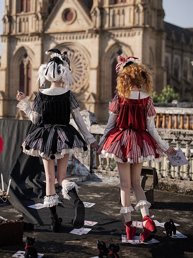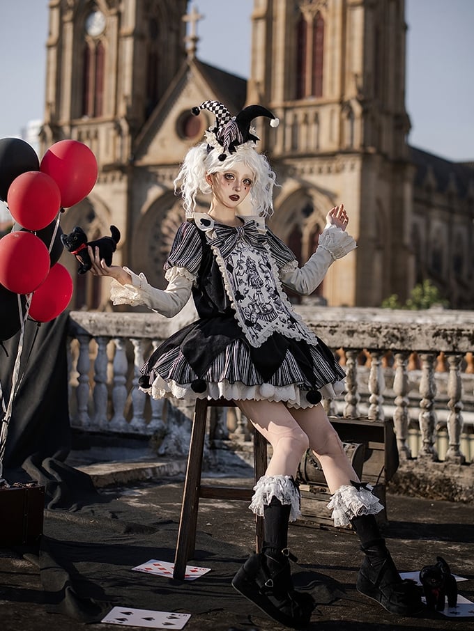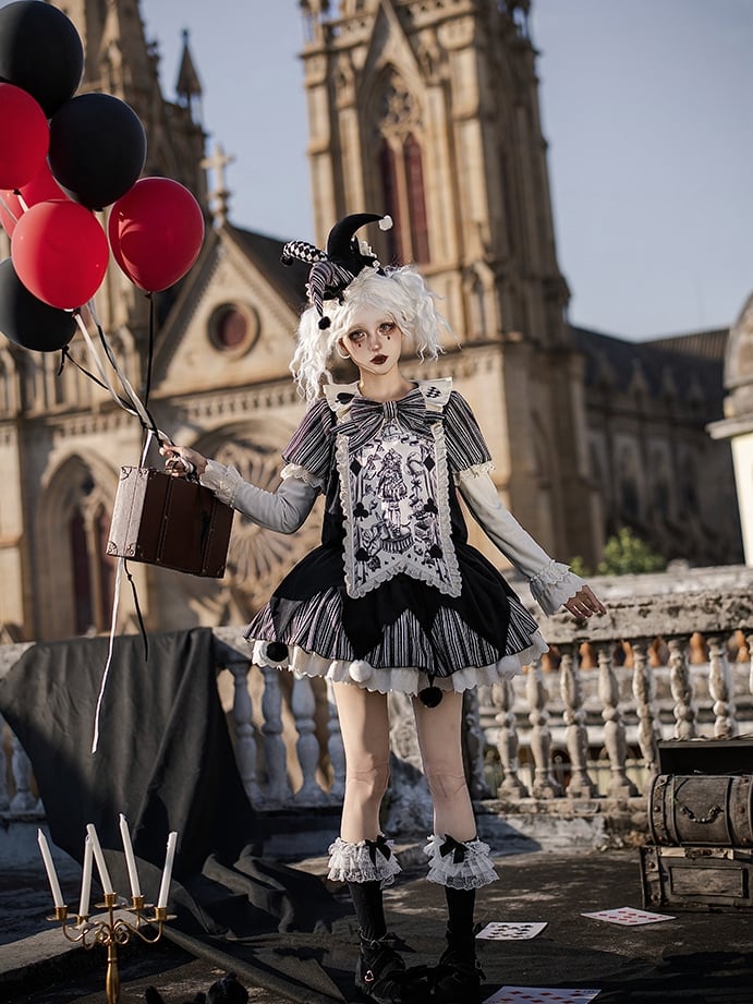 Black Stripes Clowncore Lolita Dress Set - Juliette Sleeves OP + Detachable Printed Panel + Bow + KC + Waist Belt