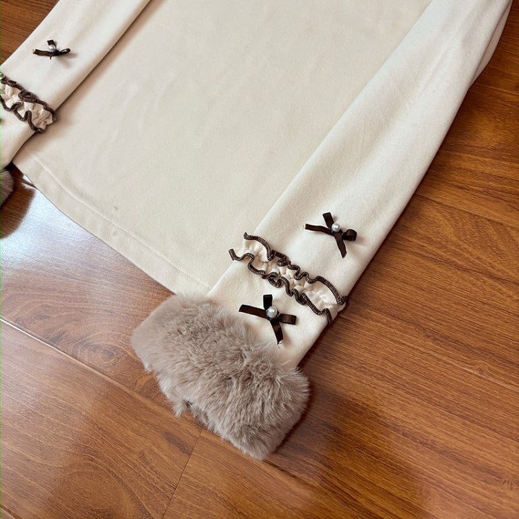 Coffee Autumn/Winter Lolita Long Sleeves Cozy Top with Ruffles, Plush Cuffs & Bow Details