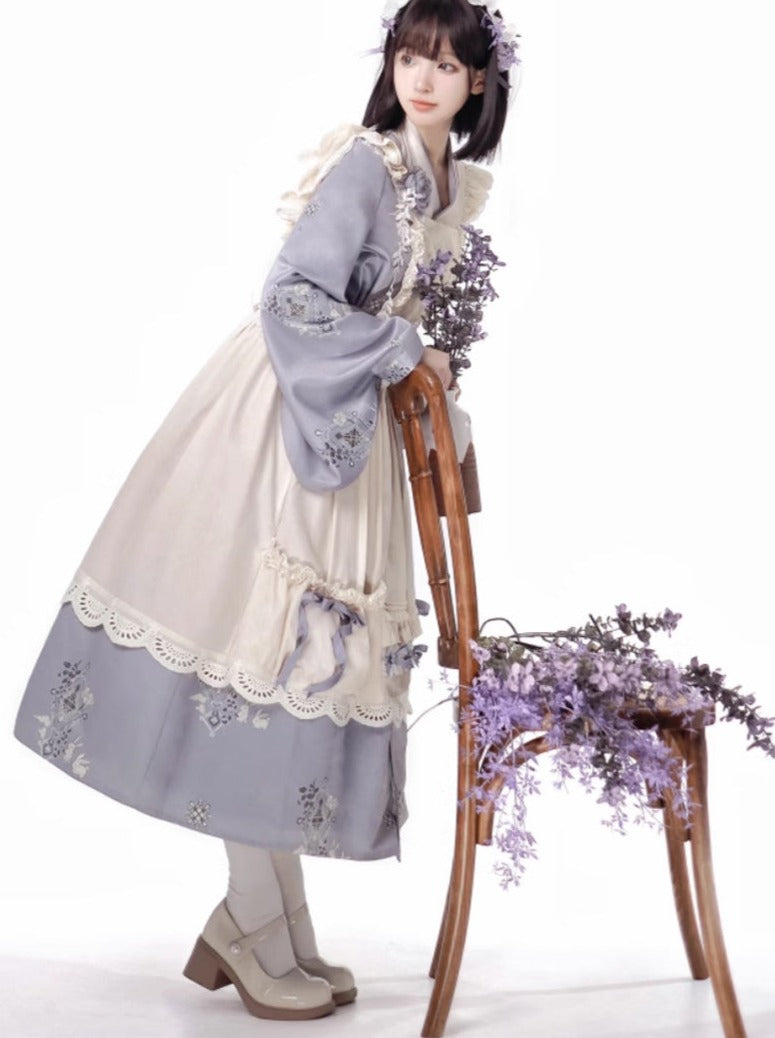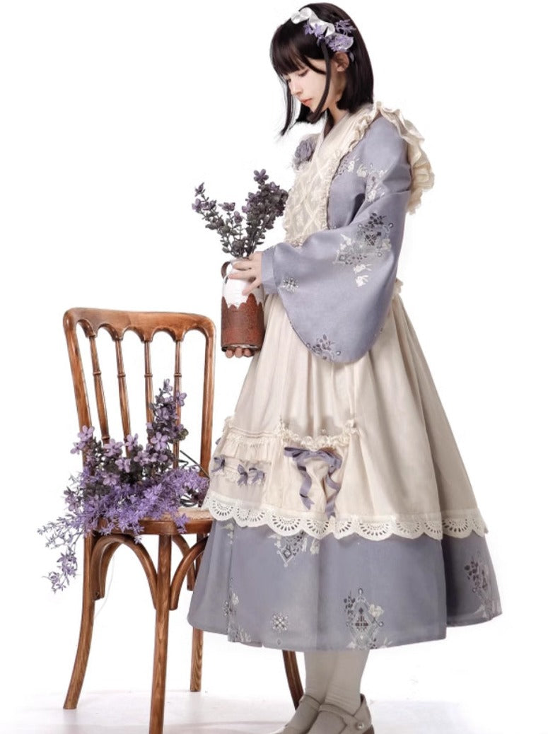 Blue and White Old School Lolita Fashion Dress Bowknot Detais JSK Set