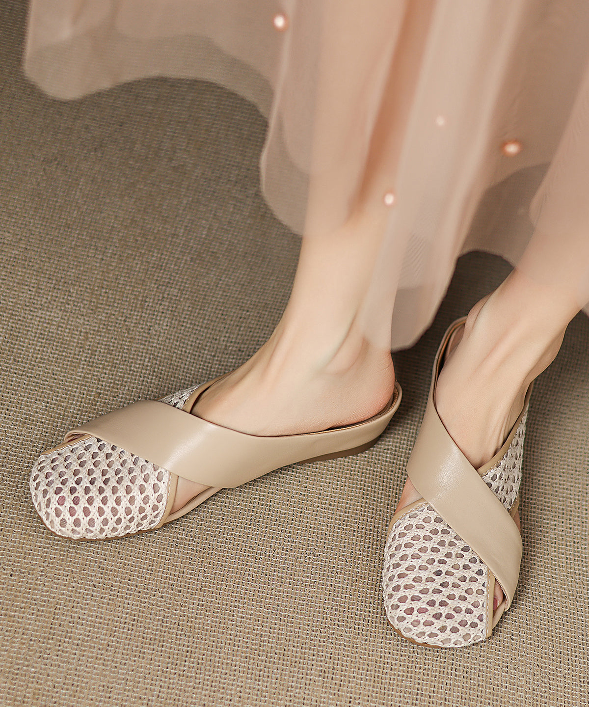 Brown Sheepskin New Splicing Breathable Mesh Slide Sandals