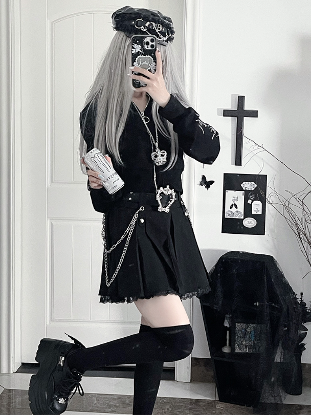Metal ChainsCross Gothic Studded Motif Black Side PUBelt Lace Hem+Black Skirtwith