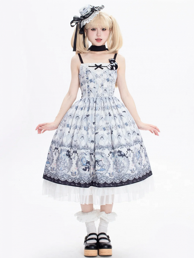Blue and White Old School Lolita Fashion Dress Bowknot Detais JSK Set