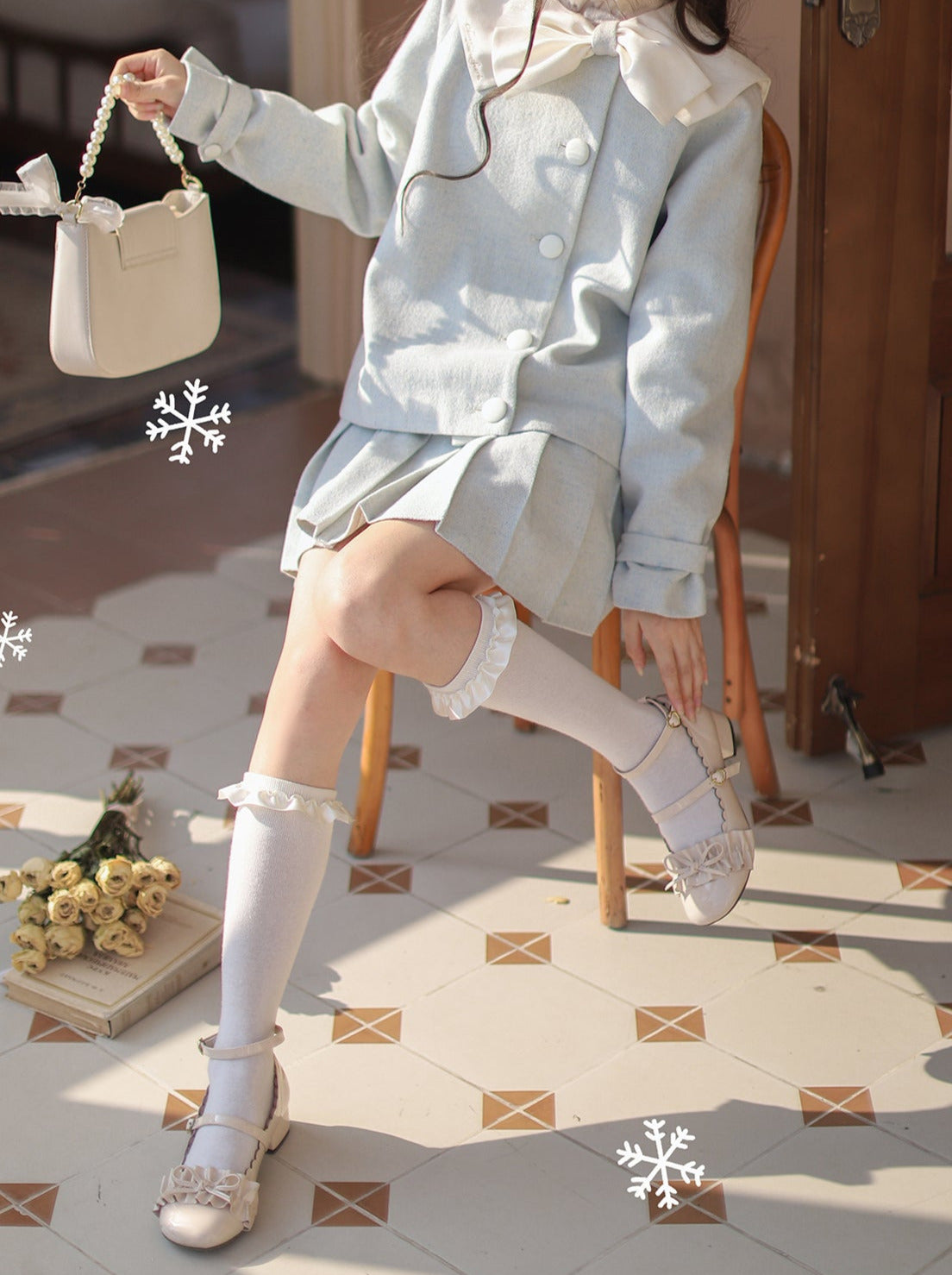 Lovely and sweet, this Mint Lolita Ribbon Collar Skirt and Retro Green Pleated Jacket set is an adorable addition to any wardrobe. With a charming ribbon collar and playful pleated skirt, this outfit will surely turn heads. Perfect for any retro or vintage lover.