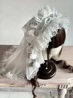 Multi-Color Lolita Hairband with Lace Head Veil (Pom-Pom Accents)