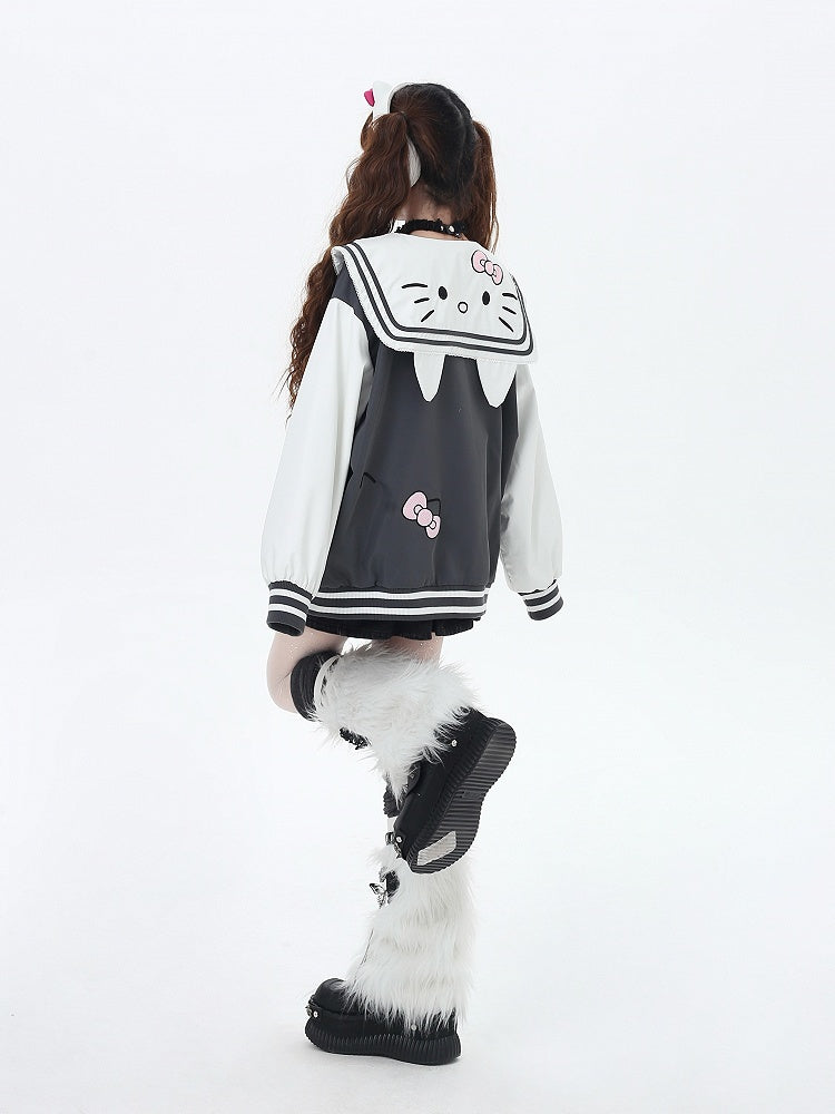 Navy Blue/Gray Sailor Collar Kitty Embroidered Baseball Jacket