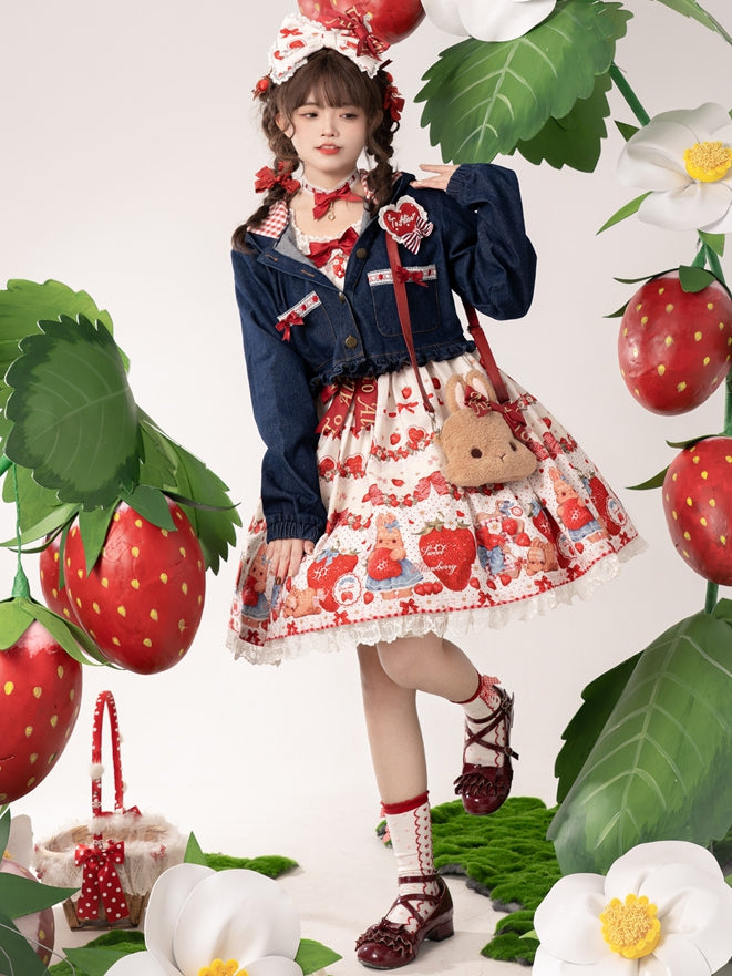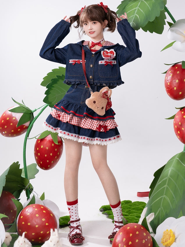 Navy Blue Heart Applique Bunny Ear Hooded Denim Short Jacket Ruffle Hem