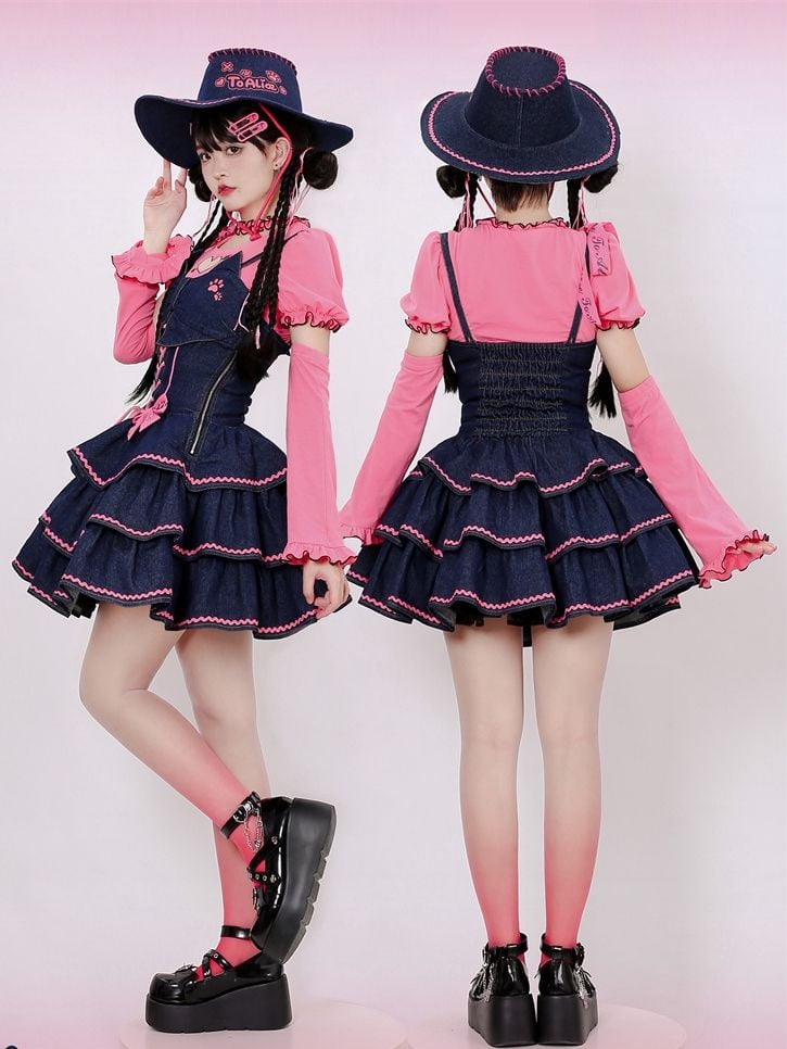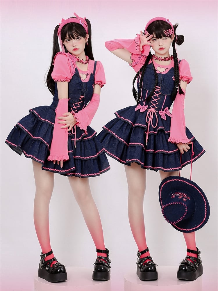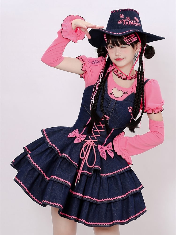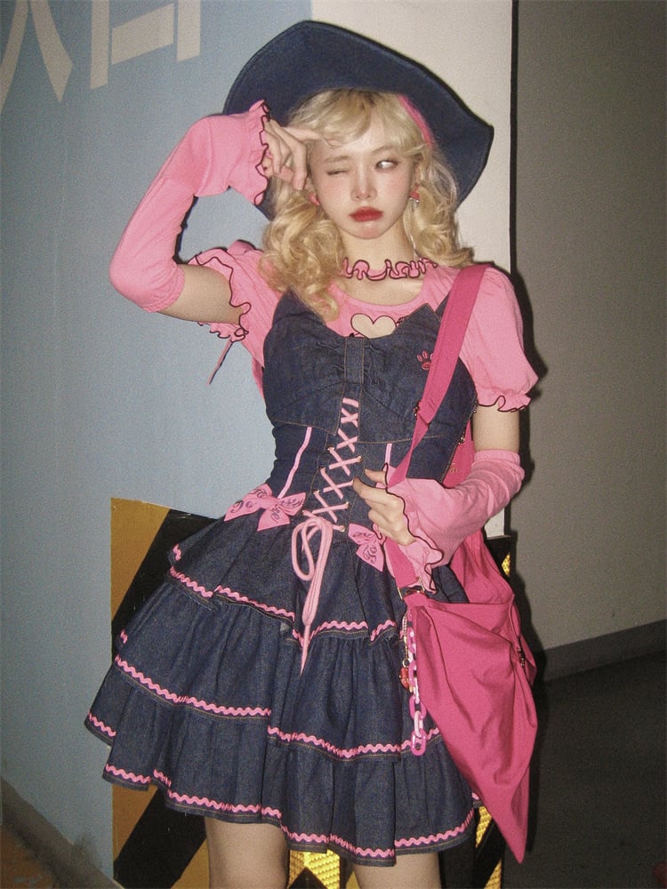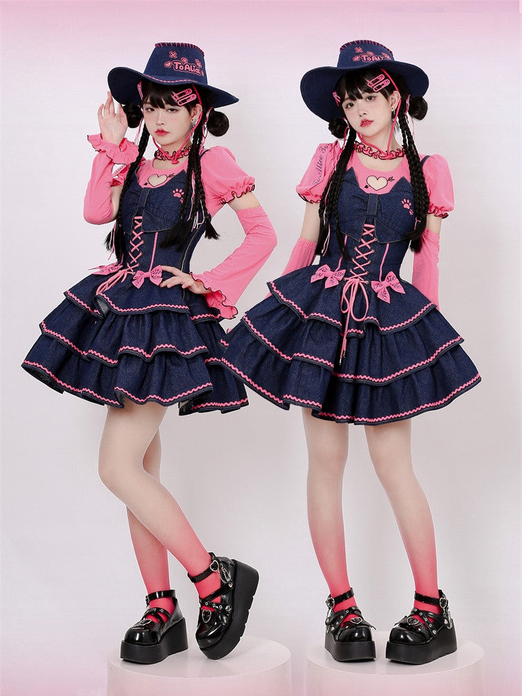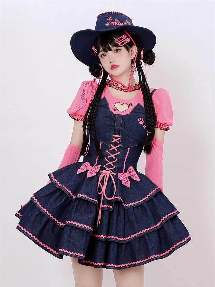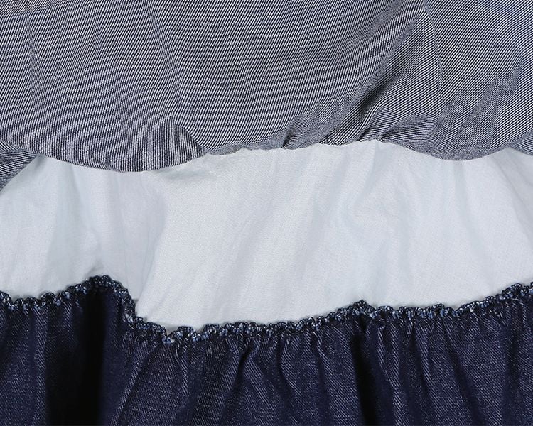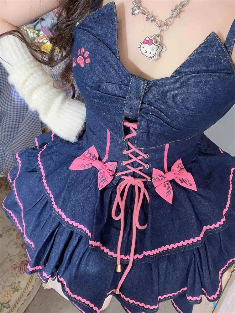 Navy Blue Lace-up Detail Sweet Bow Accents Tiered Skirt Denim Slip Dress