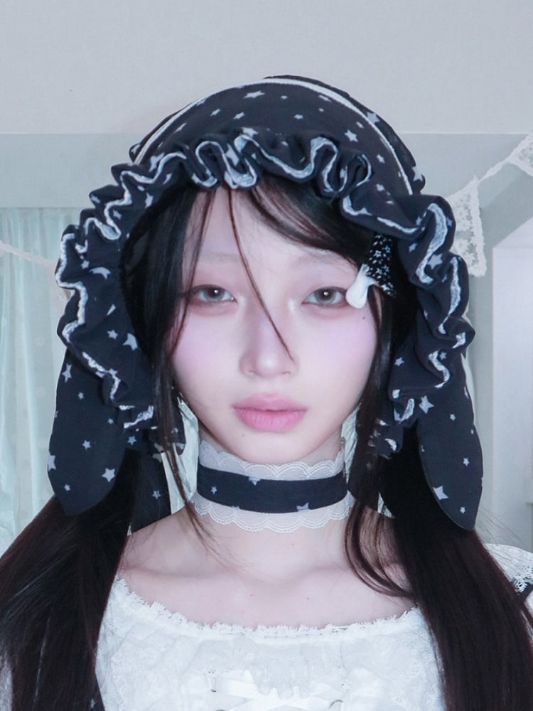 Navy Blue Bunny Ear Chiffon Bonnet with White Star Print & Lace Trim