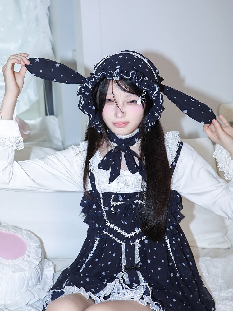 Navy Star Print Trim Bonnet White Blue Chiffon Bunny with Lace Ear