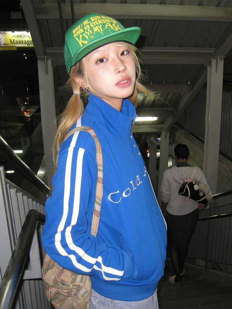 Blue Mock Neck Zip Jacket with Stripe Trim & Lettering Embroidery