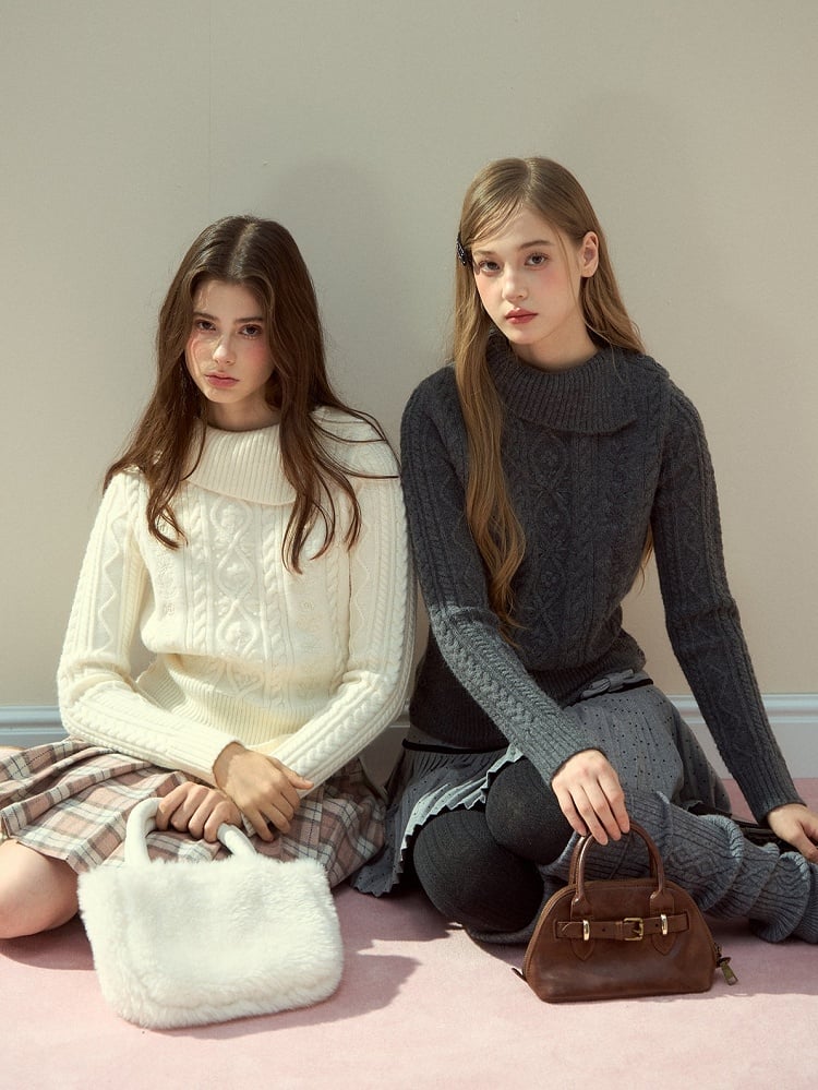 Vintage Elegant Gray Cable Knit Mock Neck Sweater