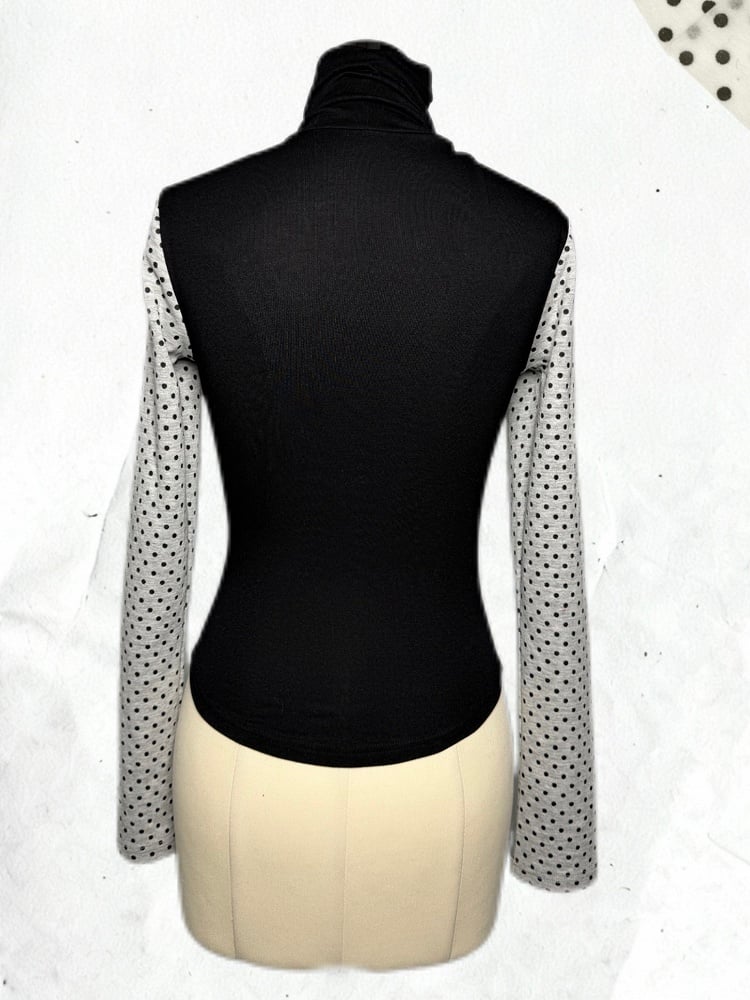 Black Gothic High Neck Long Sleeve Top - Polka-dot Pattern, Colorblock Design & Cross Decor