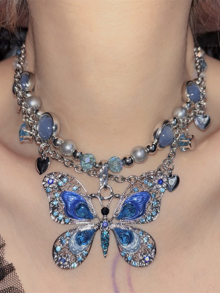 Blue/Brown Butterfly Pendant Beaded Necklace
